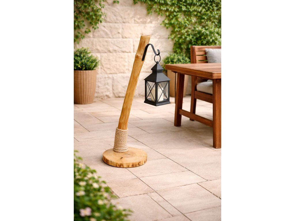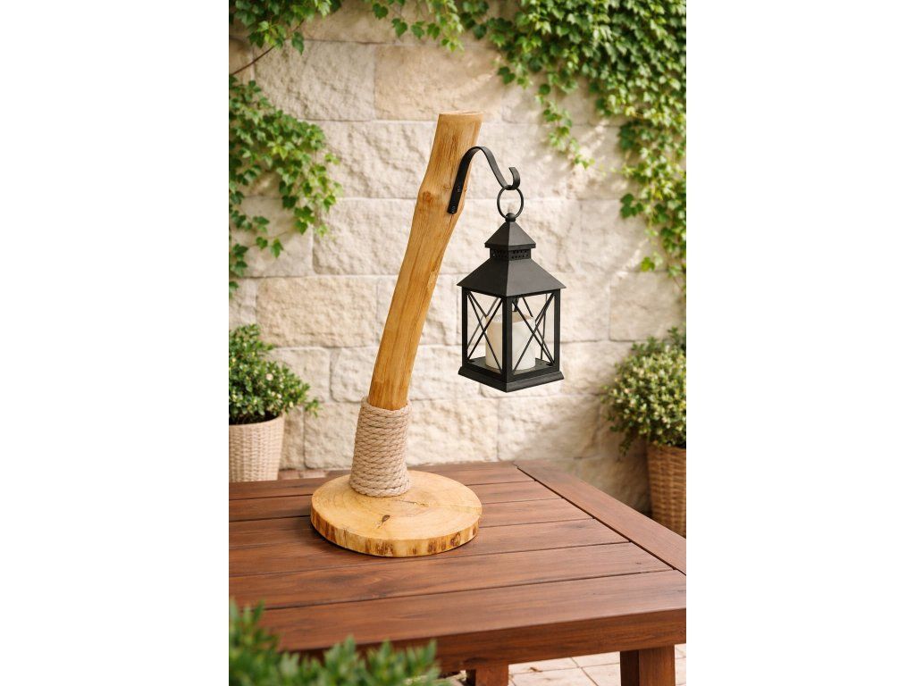 Díky kombinaci masivního dřeva a černé kovové lucerny se hodí do moderních i venkovských exteriérů i interiérů.