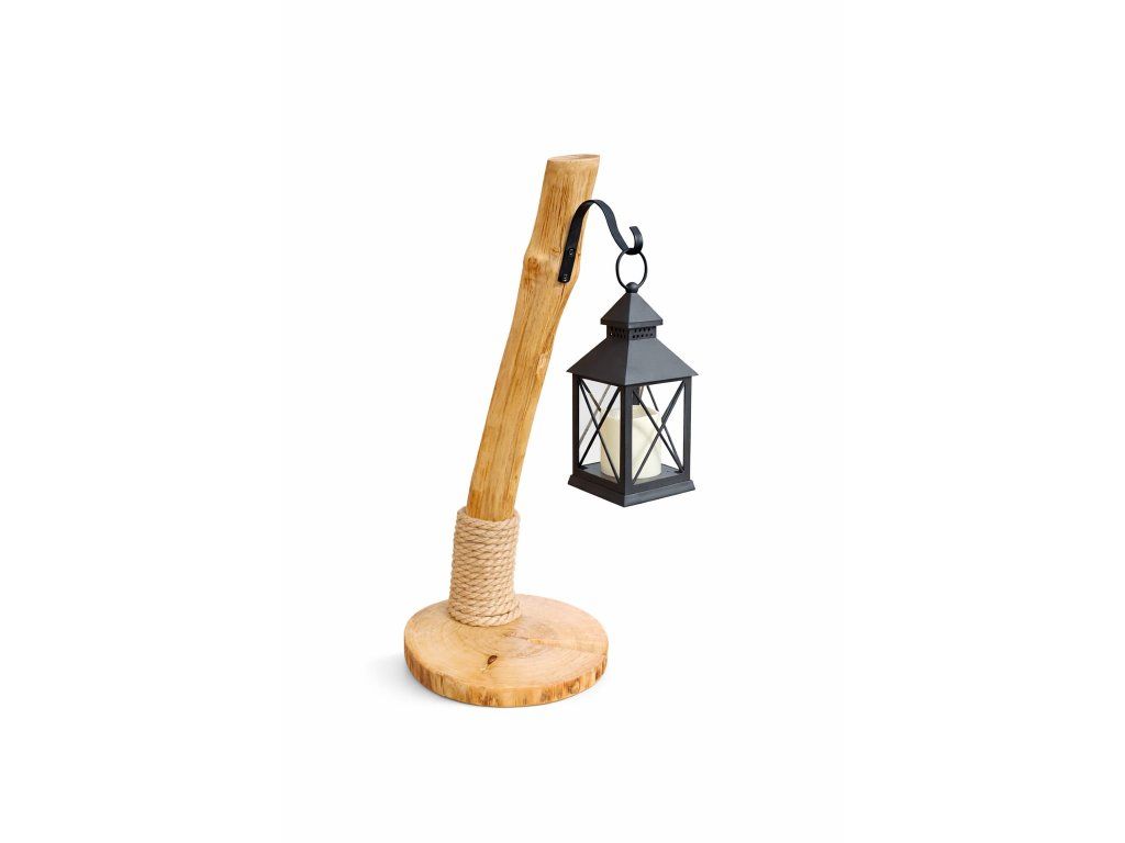 Součástí stojanu je také kovová lucerna se svíčkou, která vytváří příjemnou a útulnou atmosféru při večerním posezení. Stabilní kulatá podstava z masivního dřeva zajišťuje pevné postavení a přírodní jutové zdobení podtrhuje rustikální vzhled celé dekorace.