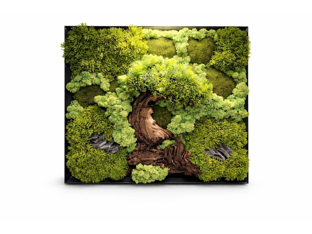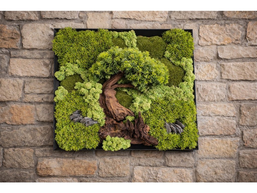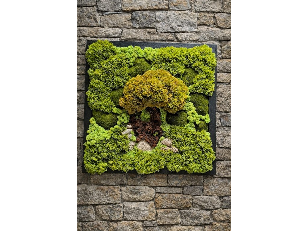 Ručně vyráběný mechový obraz s plastickým motivem stromu, vytvořený kombinací umělého mechu a pravého stabilizovaného islandského mechu. Kompozici doplňují přírodní dřevo a kameny, které podtrhují přirozený vzhled a prostorovou hloubku obrazu.
