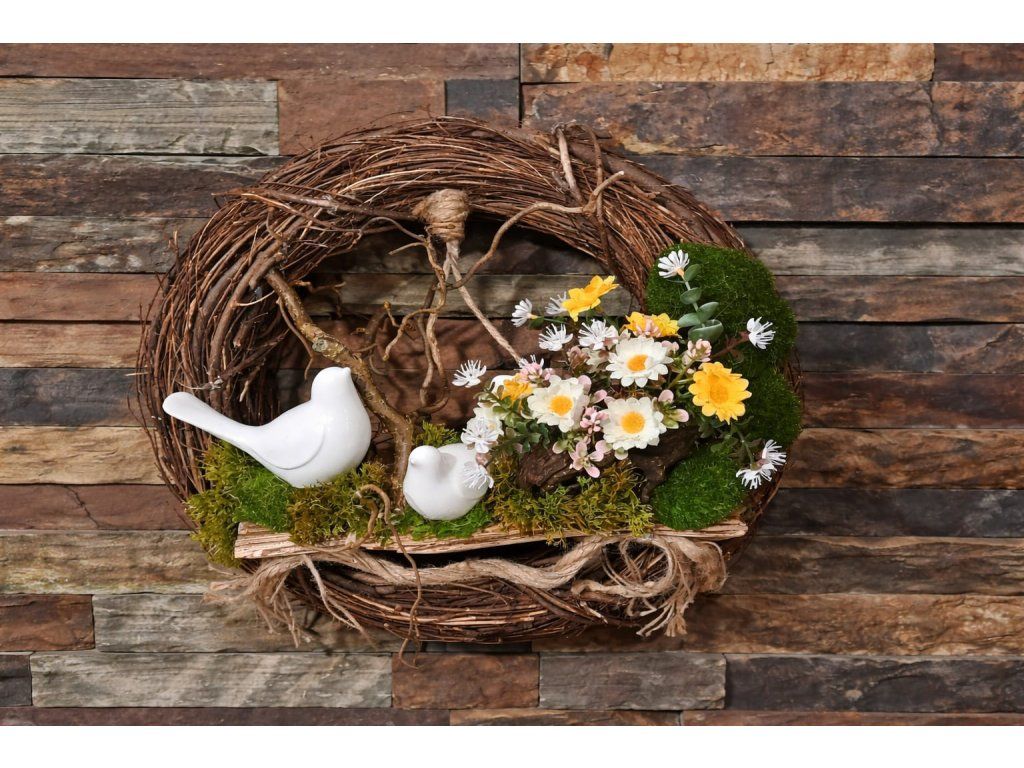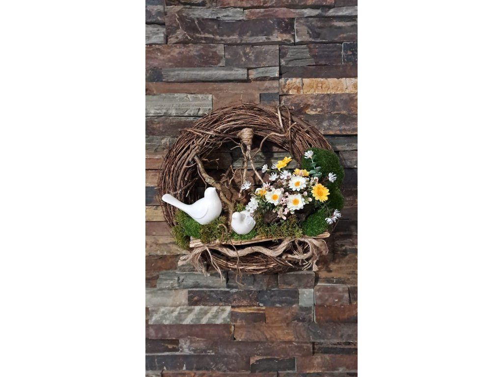 Ručně aranžovaný dekorativní věnec z přírodního proutí v rustikálním stylu. Dominantou jsou dva bílé keramické ptáčky umístěné na mechovém základu, doplněné jemnými jarními květy v bílé, žluté a pastelově růžové barvě. Celá dekorace působí přirozeně, svěže a harmonicky.
